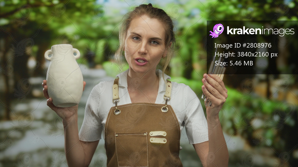 Young woman in apron holds a ceramic jar and paintbrushes, smiling while enjoying the creative process in a lush green park setting, displaying artistic passion outdoors. - Kraken Images