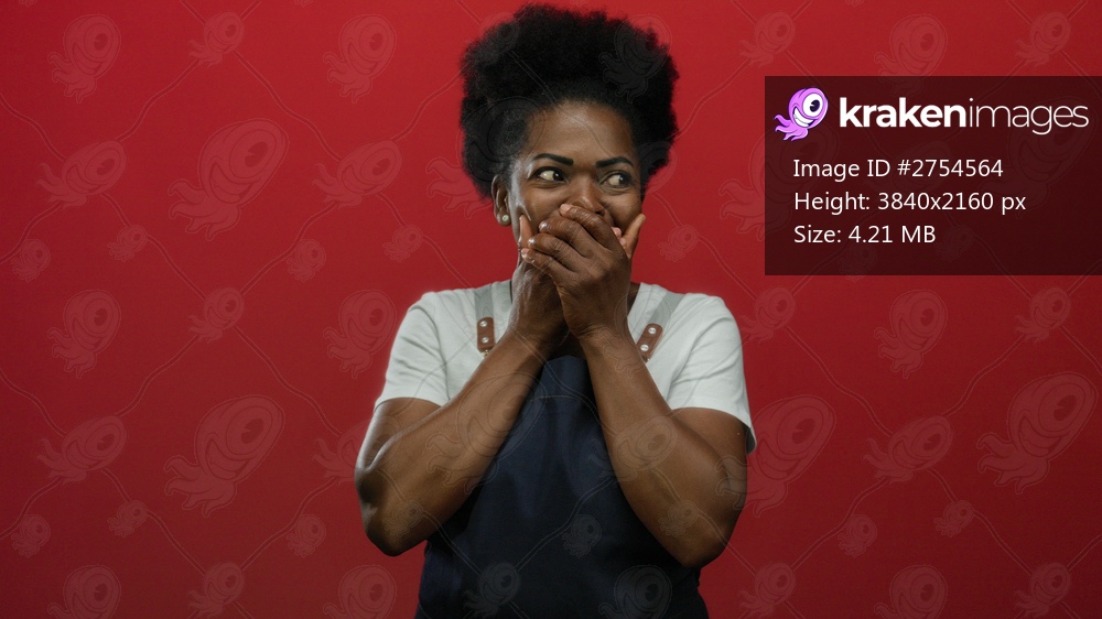 Young woman in apron on red background covers her mouth with hands expressing surprise or joy, showcasing an emotional and engaging moment.