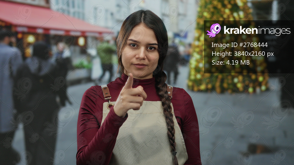 Young woman in apron pointing on street near cafe with festive lights and people walking in background.