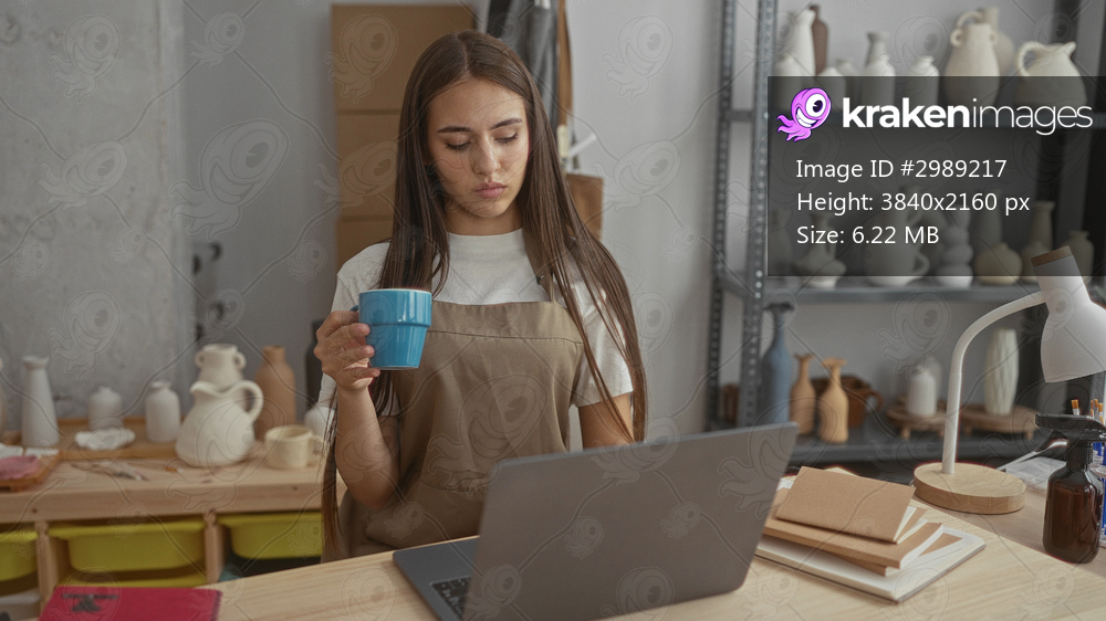 Young woman in apron reaches for a blue cup and types on a laptop amid shelves of pottery in a ceramics studio; creative concentration.