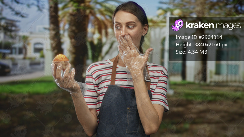 Young woman in apron and striped shirt wearing clear plastic gloves holds a muffin in one hand and covers her mouth with the other in front of a building with palm trees; surprise hygiene. - Kraken Images