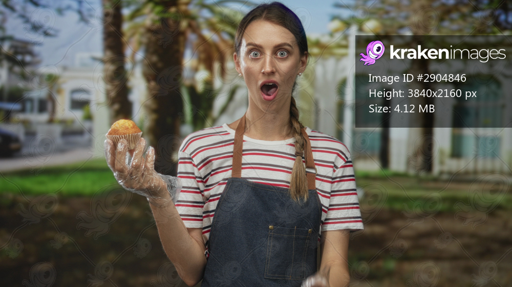 Young woman in apron and striped shirt wearing clear plastic gloves holds a muffin in one hand and covers her mouth with the other in front of a building with palm trees; surprise hygiene. - Kraken Images