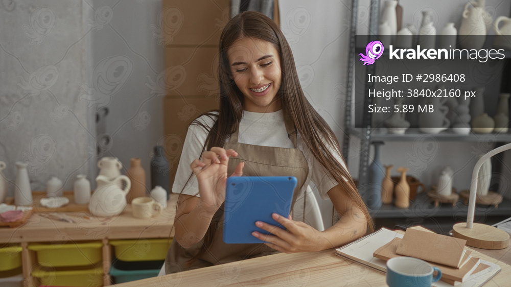 Young woman in apron tapping blue tablet with finger in pottery studio, surrounded by clay vessels and shelves; serene creativity.