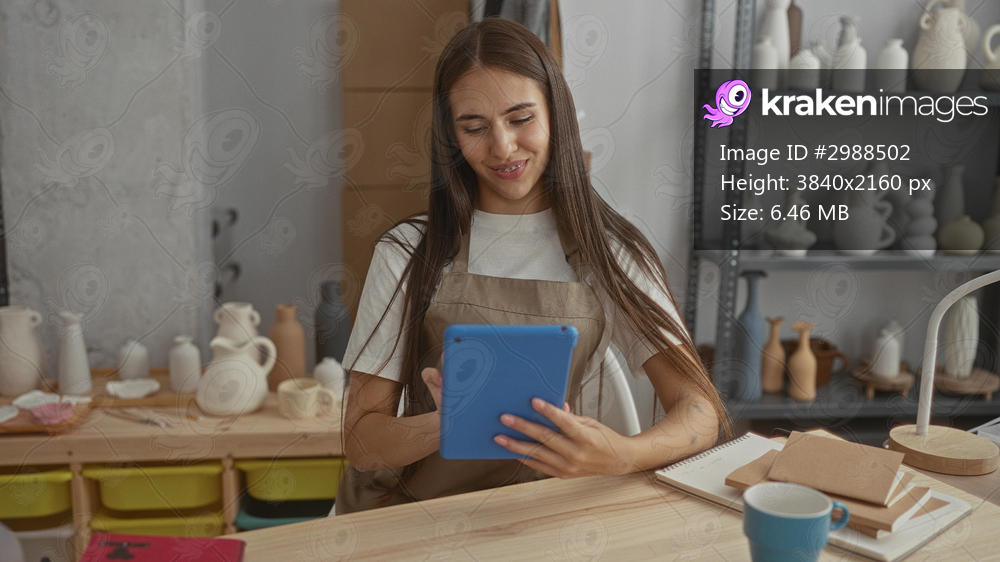 Young woman in apron tapping blue tablet with finger in pottery studio, surrounded by clay vessels and shelves; serene creativity.