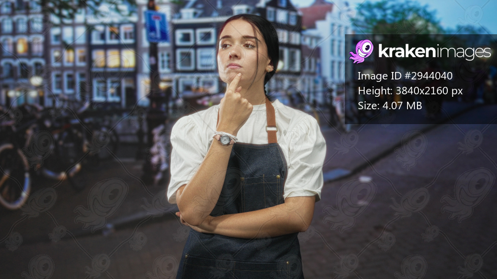 Young woman in apron touches chin with finger, arms crossed, standing by bicycles on a canal street; thoughtful curiosity.