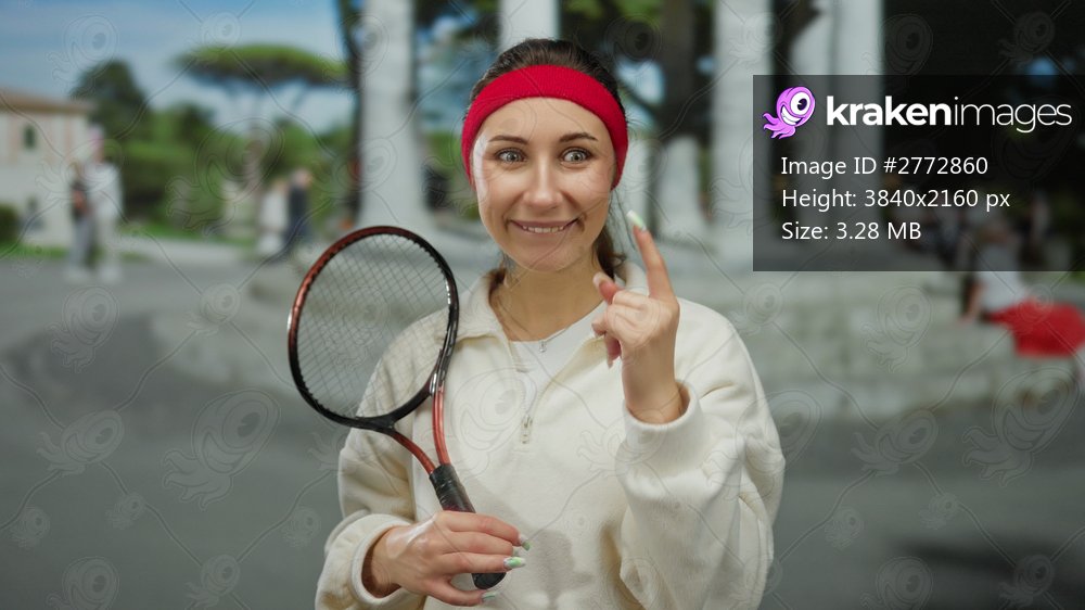 Young woman in athletic attire gestures idea with a tennis racket on a city street against a blurred outdoor urban backdrop, embodying confidence and determination. - Kraken Images