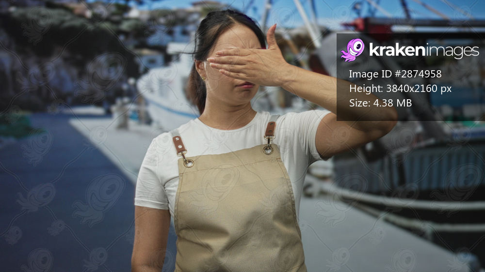 Young woman in beige apron covers eyes with hand at port dock beside boats outdoors; disgust reaction.