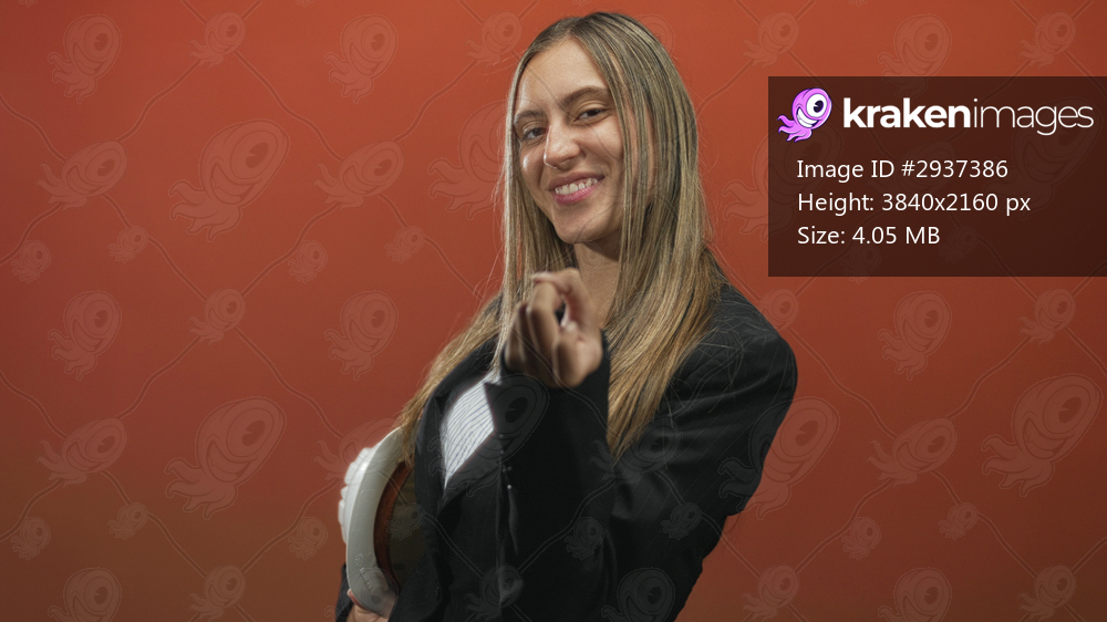 Young woman in black blazer holding white hardhat at her hip, smiling and beckoning with fingers in studio red backdrop; confidence.