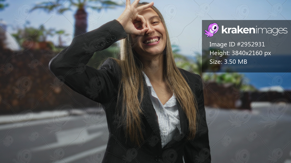 Young woman in black blazer and striped shirt makes ok sign with hand to eye on coastal street by the ocean; playful confidence.