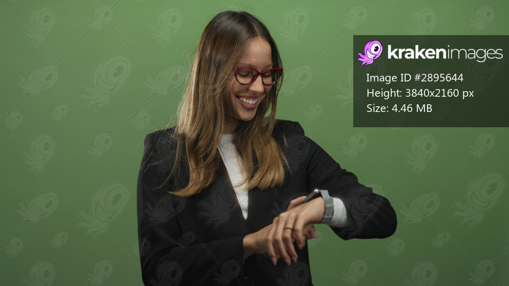 Young woman in black blazer taps smartwatch on wrist in studio with green backdrop; time management productivity.