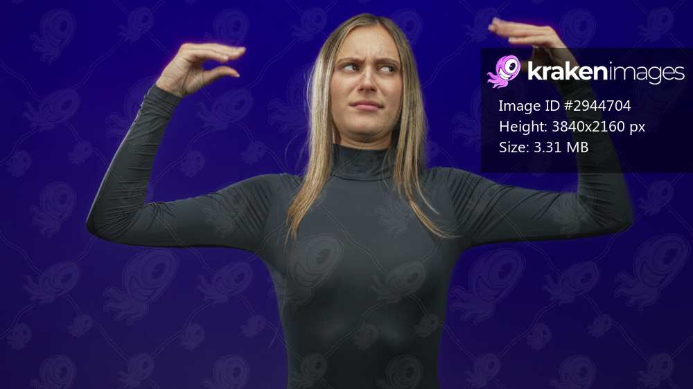 Young woman in black turtleneck with hands raised and eyes closed against purple studio backdrop; concentration.