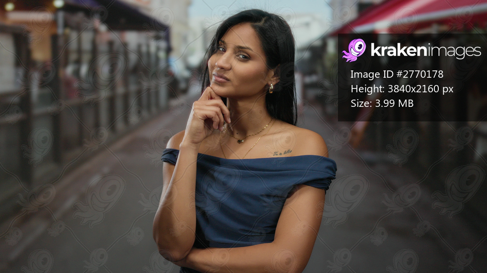 Young woman in blue dress poses thoughtfully on bustling street, embodying urban confidence with her confident smile and elegant presence in an outdoor environment. - Kraken Images