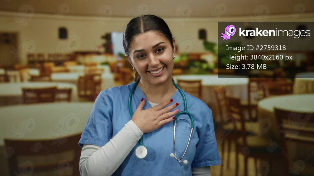 Young woman in blue scrubs and stethoscope smiles warmly in a restaurant setting, suggesting a casual yet professional encounter within an indoor environment. - Kraken Images