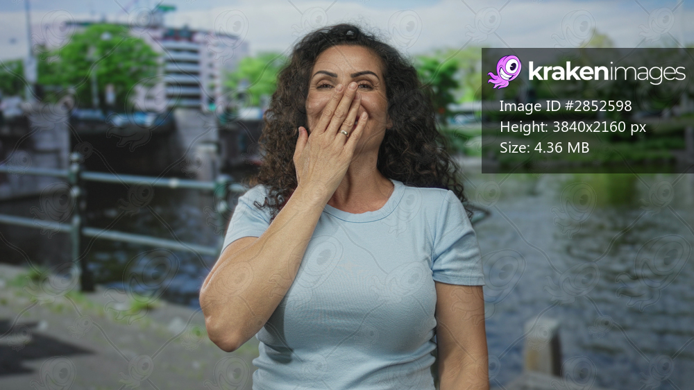 Young woman in blue shirt covers eyes with hands on street beside canal waters; surprise curiosity wonder amazement.