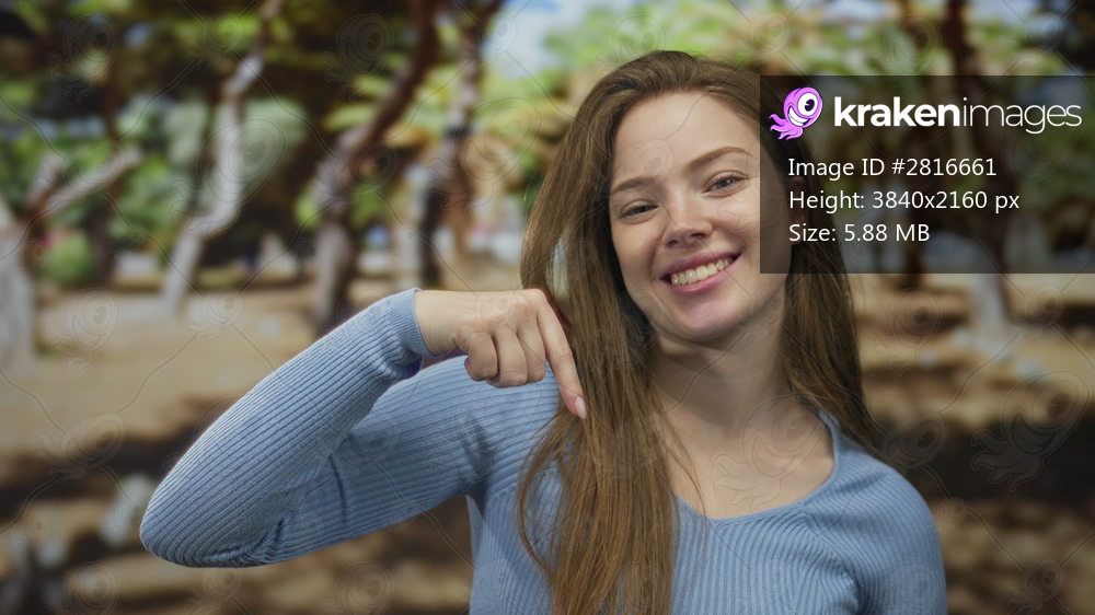 Young woman in blue shirt smiling and pointing finger downward amidst sunlit green forest trees; happiness.