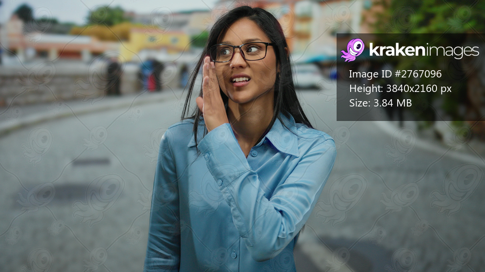 Young woman in blue shirt whispering on a vibrant city street, capturing a candid, joyful outdoor moment with a background of colorful buildings.