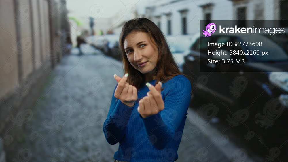 Young woman in blue sweater making heart symbols with fingers on a city street with parked cars.