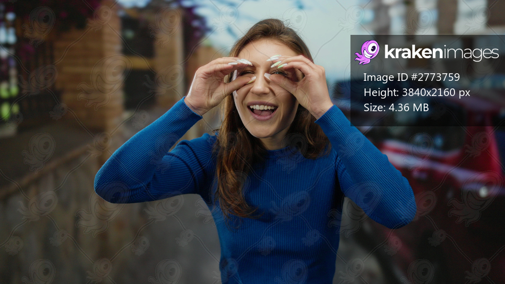 Young woman in blue sweater mimicking binoculars playfully on a busy city street with a joyful expression surrounded by urban buildings and parked cars in the background. - Kraken Images