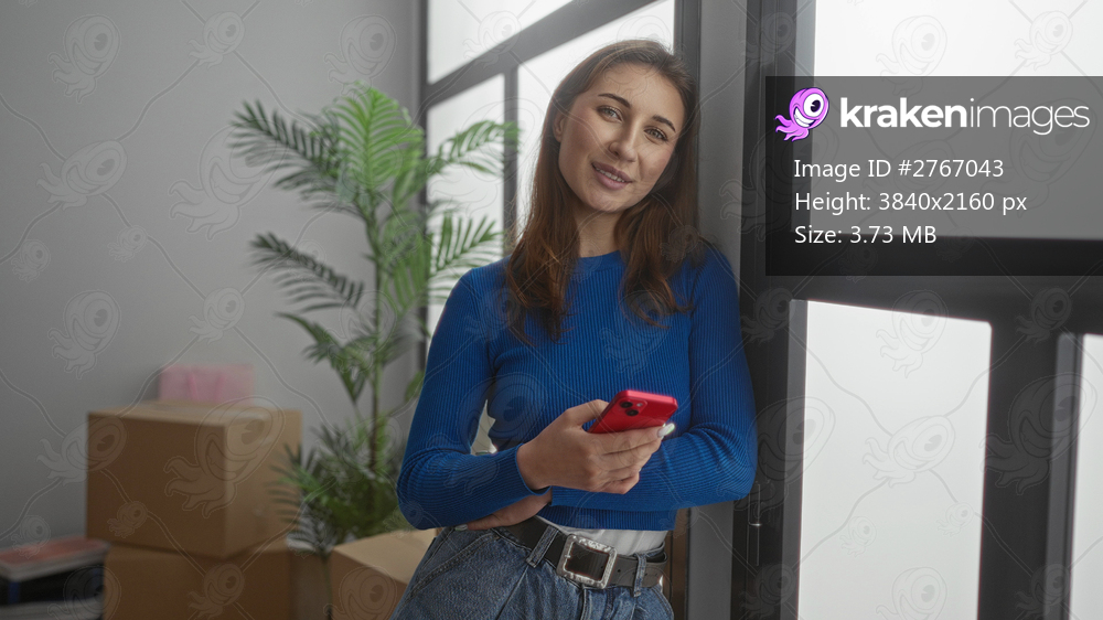 Young woman in blue sweater uses smartphone in her new home with unpacked boxes in modern bright living room.