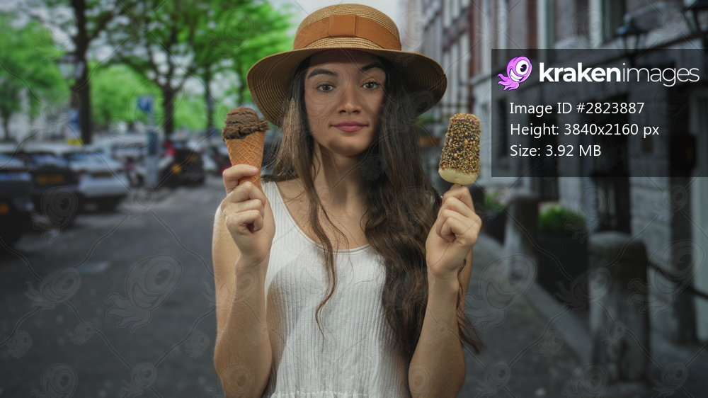 Young woman in brown straw hat holds chocolate icecream cone on a bustling city street; summer joy.