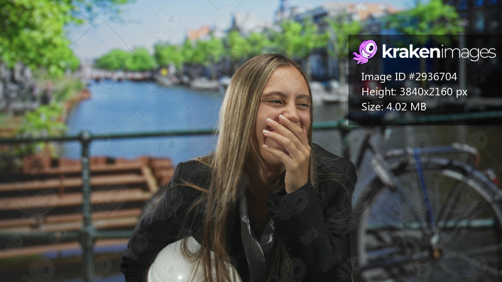 Young woman in business suit holding a white hardhat and covering her mouth while laughing on a street bridge by a canal; carefree joy.