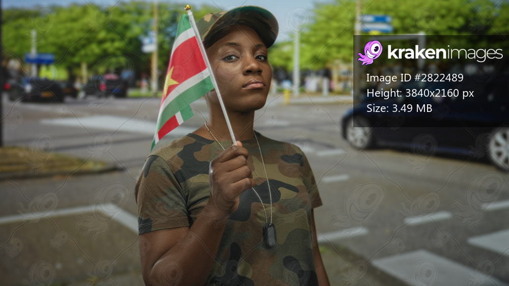 Young woman in camouflage uniform with dog tags holds suriname flag on busy city street; pride duty.