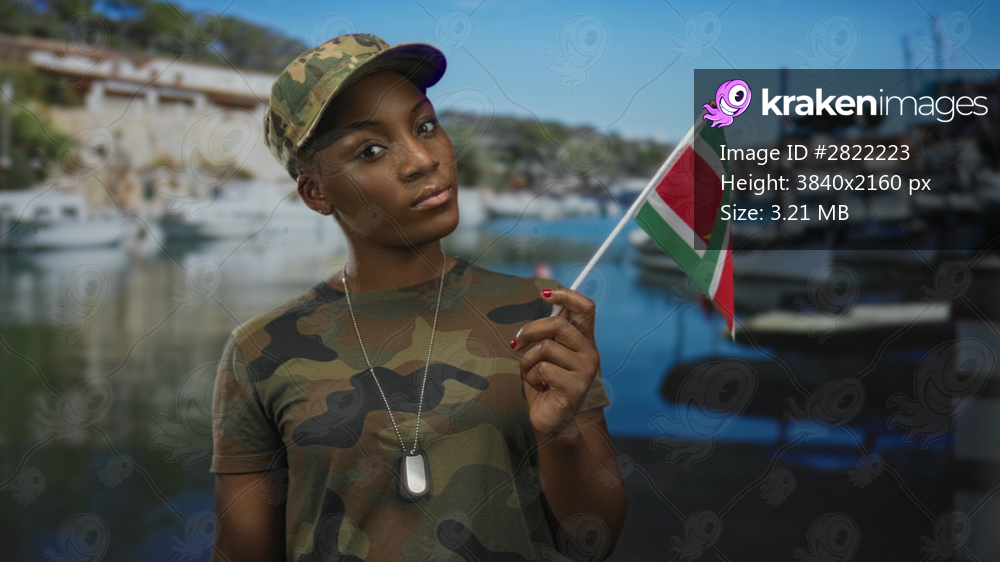 Young woman in camouflage uniform holds suriname flag aloft on street lined with boats and buildings by water; pride.