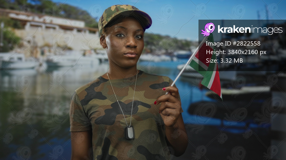 Young woman in camouflage uniform holds suriname flag aloft on street lined with boats and buildings by water; pride.