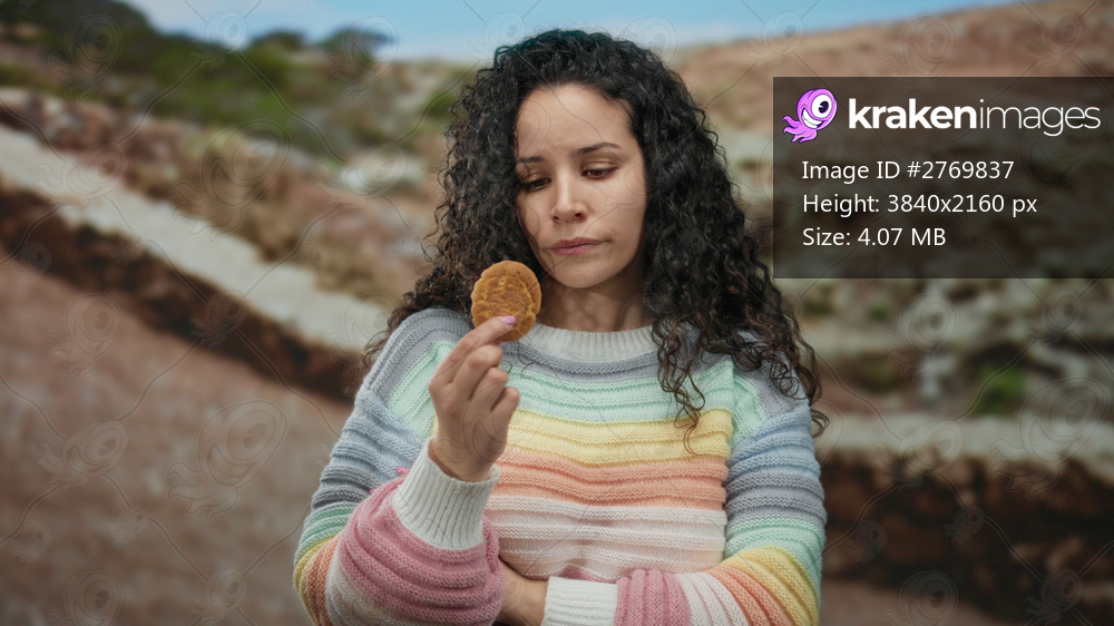 Young woman in colorful sweater holding cookie outdoors on street with thoughtful expression, casual setting against rocky background.