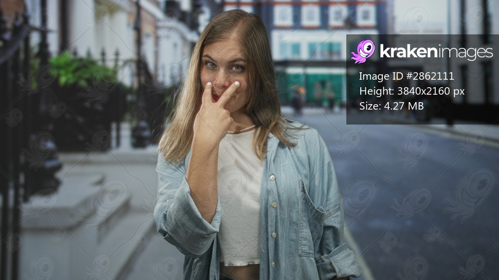 Young woman in denim shirt and white tanktop pointing finger toward camera on an urban street; highlight confidence.