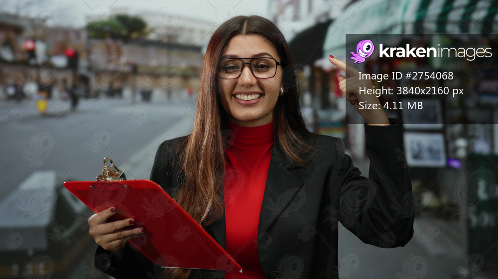 Young woman in glasses holding red clipboard on busy street smiles while pointing to her head under overcast sky, capturing vibrant urban energy and confidence - Kraken Images
