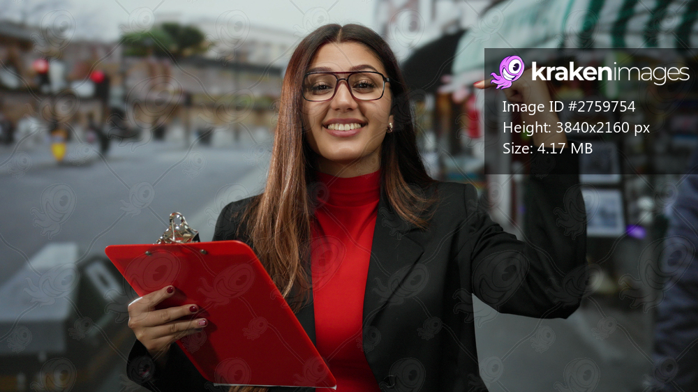 Young woman in glasses holding red clipboard on busy street smiles while pointing to her head under overcast sky, capturing vibrant urban energy and confidence - Kraken Images