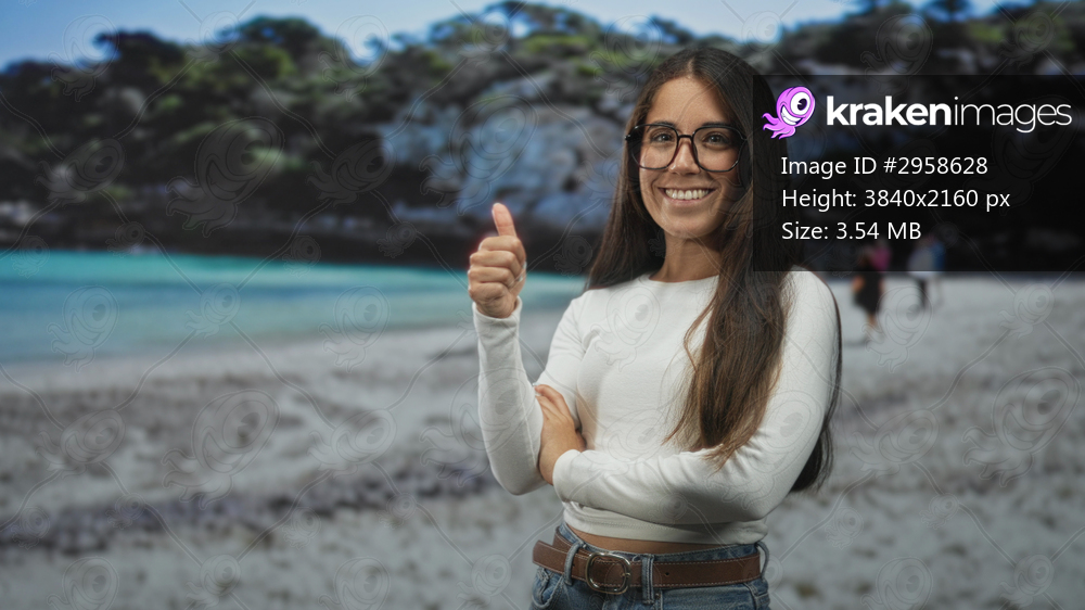 Young woman in glasses and white top showing thumbs up with crossed arms on a sandy beach cove shoreline, smiling at camera; optimism friendliness.