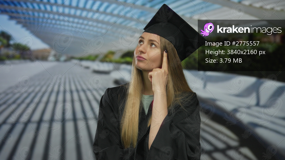 Young woman in graduation attire stands thoughtfully in a city street under modern architecture, reflecting on her future.