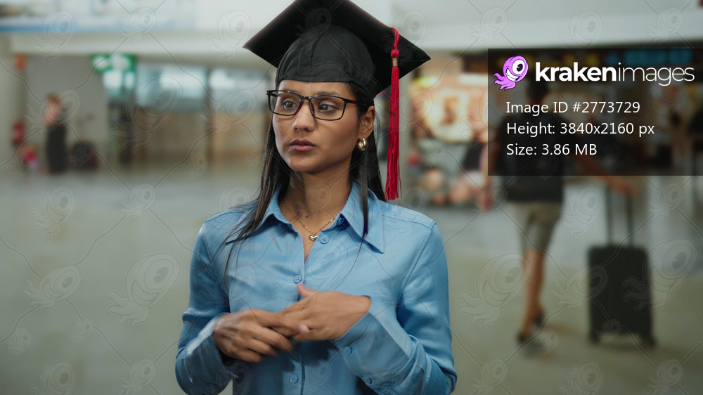 Young woman in graduation cap and glasses standing in an airport terminal with blurred travelers in the background symbolizing transition and new beginnings. - Kraken Images