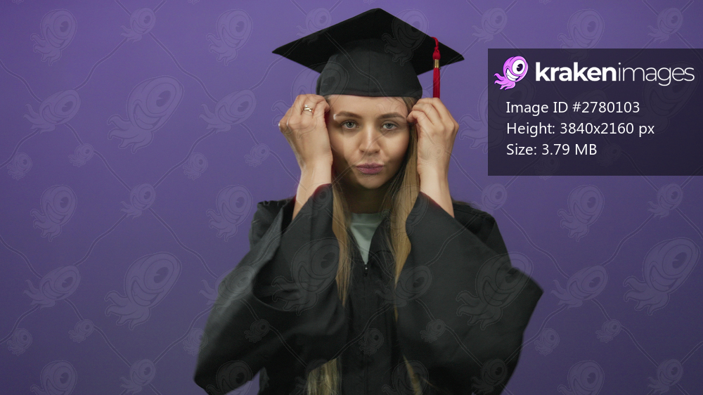 Young woman in graduation cap and gown making expressive gestures with a playful look against a vibrant purple background.