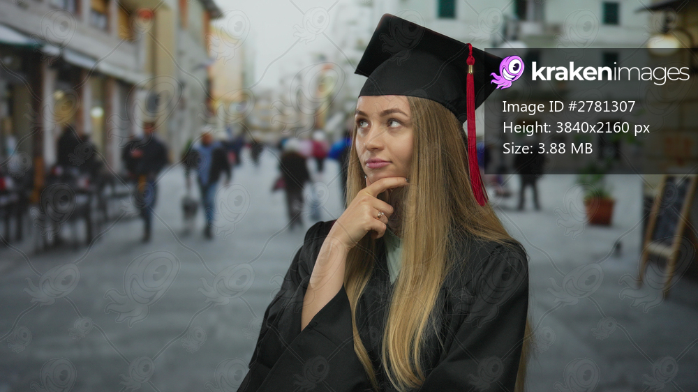 Young woman in graduation cap and gown stands thoughtfully on a busy city street, blending academic achievement with urban life in a vibrant outdoor setting. - Kraken Images