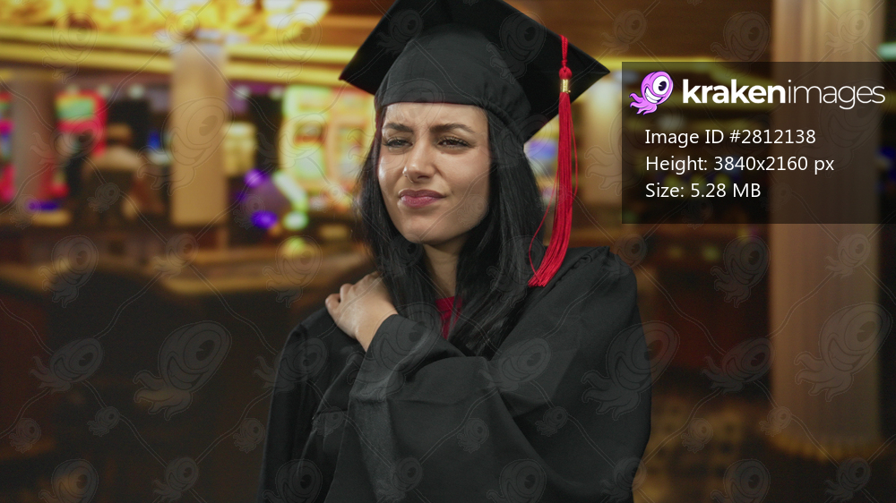 Young woman in graduation gown feeling shoulder pain indoors at a casino with colorful slot machines.