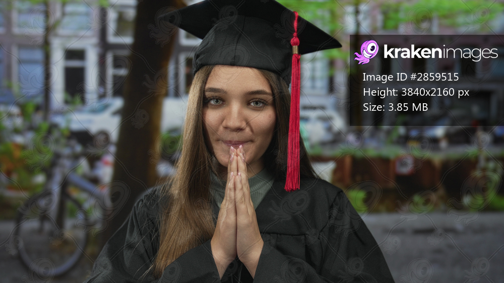 Young woman in graduation gown and mortarboard crosses fingers on city street with parked bicycle; hope excitement anticipation optimism.
