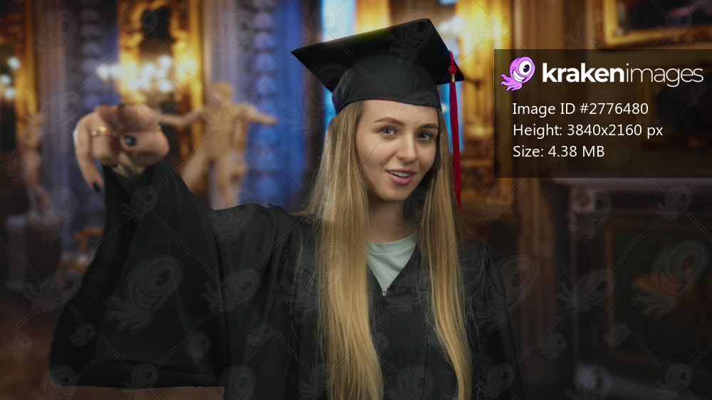 Young woman in graduation gown poses confidently inside an elegant museum showcasing art and culture highlights.