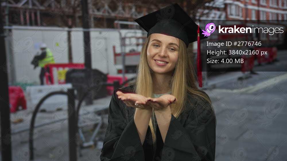 Young woman in graduation gown smiling at a construction site, symbolizing new beginnings and diverse career paths in the outdoor industrial environment. - Kraken Images