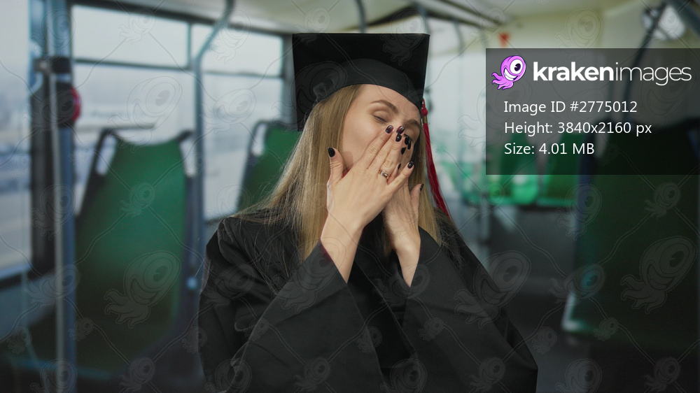 Young woman in graduation gown smiling and blowing a kiss on a bus, representing celebration and achievement in an unexpected location.