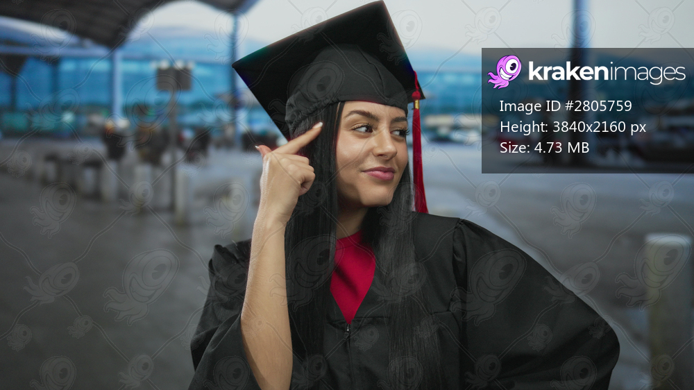Young woman in graduation uniform gestures outdoors at an airport, embodying thoughtful success and future aspirations.