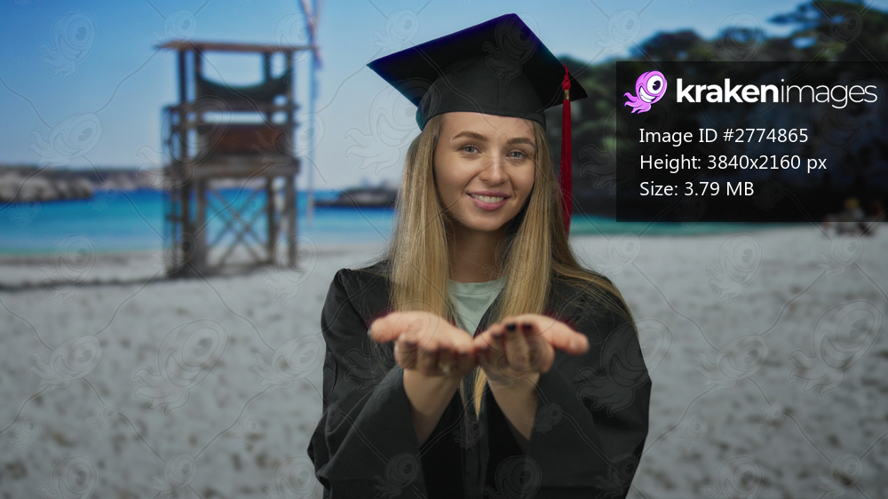 Young woman in graduation uniform smiles on a beach near the sea with palms open against a blue sky and lifeguard tower in the backdrop.