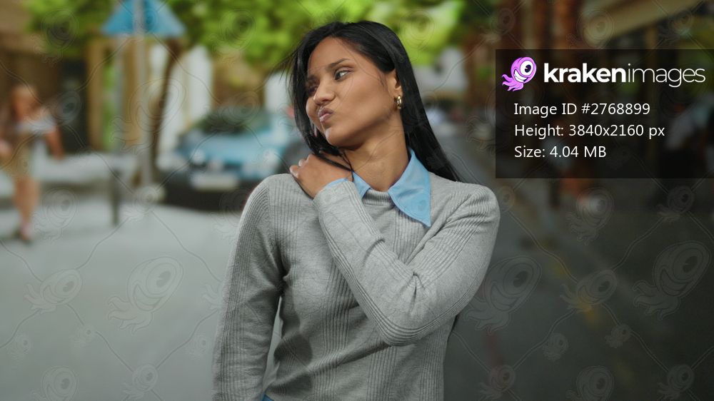 Young woman in gray sweater holds shoulder in discomfort on urban street with blurred background and trees lining the sidewalk.