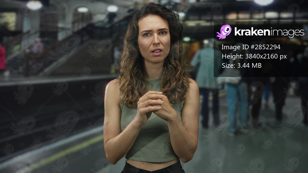 Young woman in green crop top clasping hands showing bare midriff beside train carriage in busy building; uncertainty.
