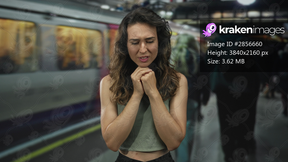 Young woman in green crop top clasping hands showing bare midriff beside train carriage in busy building; uncertainty.