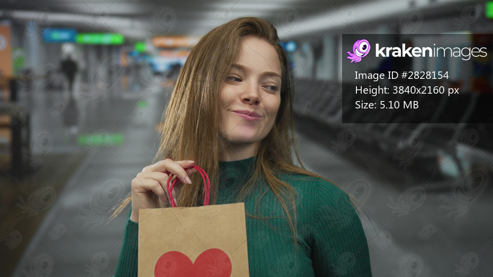 Young woman in green sweater smiles holding heart printed paper bag in spacious airport terminal; travel excitement.