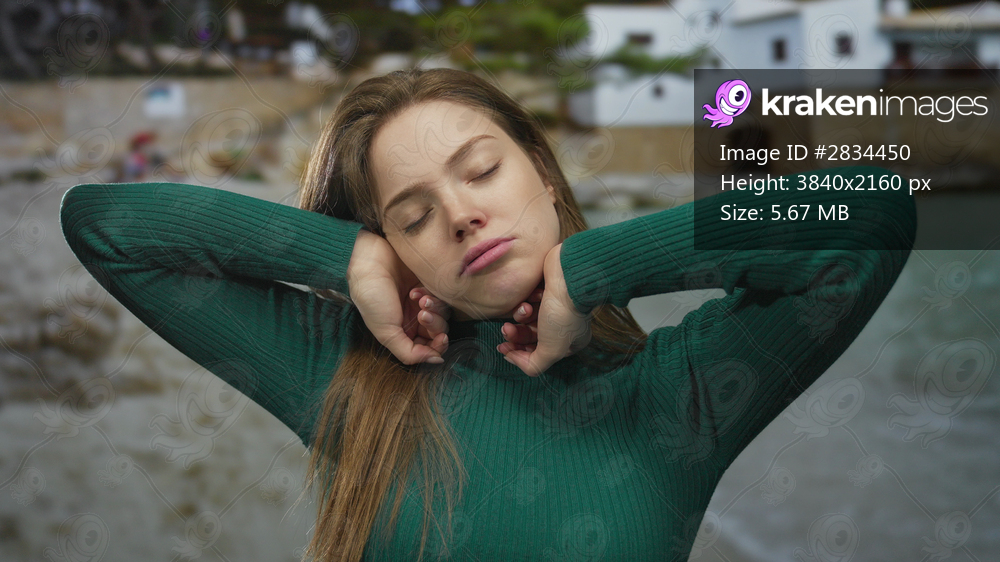 Young woman in green sweater stretches neck and arm at the beach on a sunny shore under clear sky; fatigue.