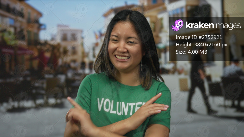Young woman in green volunteer shirt smiling joyfully outdoors on a busy city street, embracing community spirit and engagement.